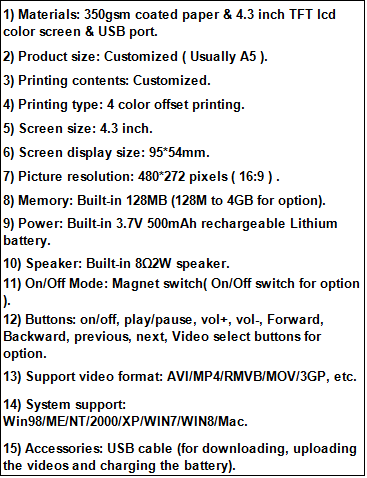 Material: Paper Product Type: Folded Paper Display: 4.3inch, Battery: Lithium 300~3500mA Video format: MP4,3GP,AVI and MOV,ANI Picture format: BMP,JPG and JPEG Music format: MP3,WMA,PCM Power on/off: magnetic induction switch or push button Working time: >2hours Charging time: 2-3hours Paper Size: A4,A5 or customized size brief description: cheap wedding invitations MP4 player lcd hd video card booklet
